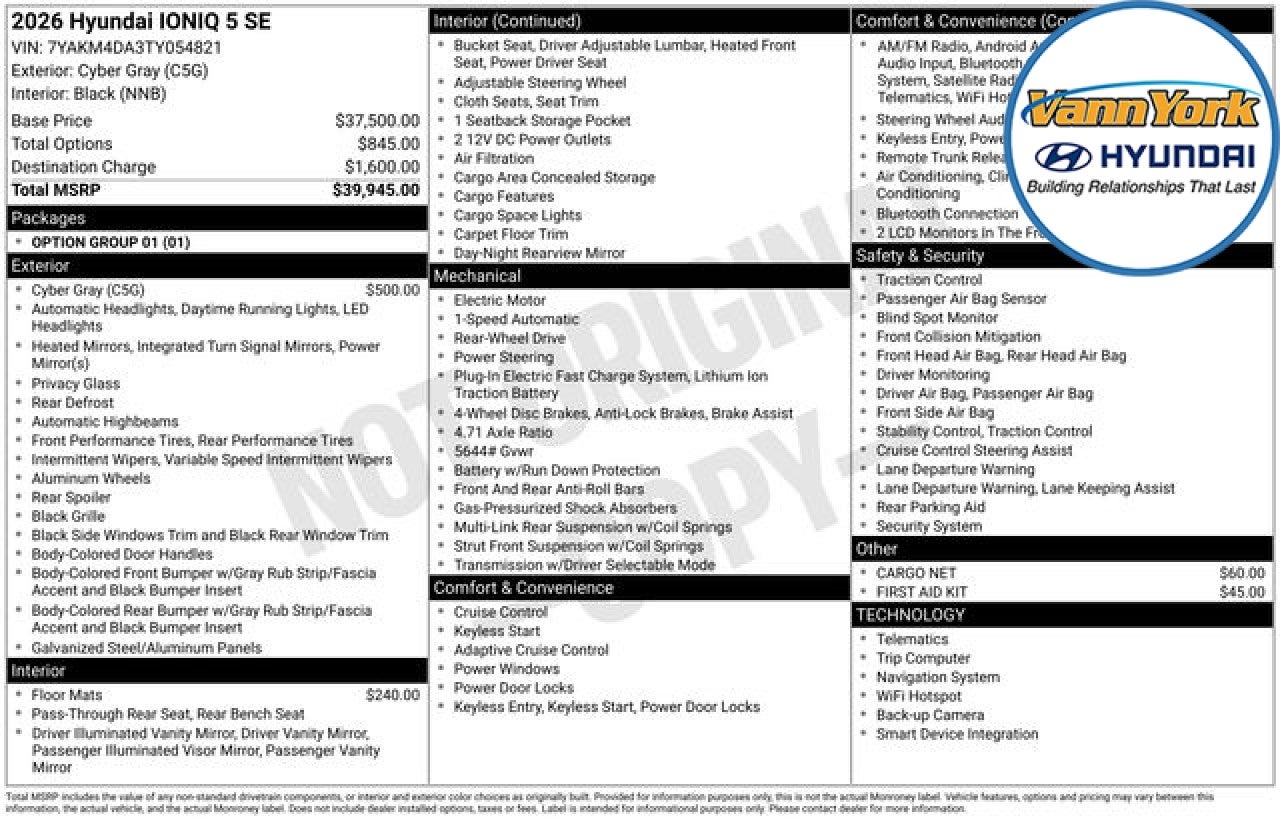 Discover the exceptional 2026 Hyundai IONIQ 5 SE, a cutting-edge electric vehicle that seamlessly blends style, performance, and advanced technology. This remarkable car is more than just a mode of transportation it's a statement of your commitment to sustainability and a glimpse into the future of automotive innovation. Boasting a sleek Cyber Gray exterior and a range of premium features, the IONIQ 5 SE is designed to captivate and impress. Key highlights include: - Navigation System - Harman/Kardon Speakers - Automatic Temperature Control - Power Driver Seat - Remote Keyless Entry - Four-Wheel Independent Suspension - Dual Front Impact Airbags - Electronic Stability Control - Auto High-Beam Headlights - Apple CarPlay & Android Auto Step inside this meticulously crafted cabin and experience the perfect balance of comfort and convenience. The Stain-Resistant Cloth Seating Surfaces and Heated Front Seats ensure you and your passengers travel in absolute luxury, while the Split Folding Rear Seat and Cargo Net provide ample versatility for all your storage needs. Powered by a state-of-the-art Electric Motor and boasting an impressive MPGe rating of 132 city and 98 highway, the IONIQ 5 SE delivers an unparalleled driving experience. With its responsive handling and smooth acceleration, you'll effortlessly navigate the roads with confidence and efficiency. Safety is of the utmost importance, and the IONIQ 5 SE is equipped with a suite of advanced safety features to give you and your loved ones peace of mind. From the Dual Front Impact Airbags and Rear Side Impact Airbag to the Electronic Stability Control and Low Tire Pressure Warning, this vehicle is designed to protect you at every turn. As you embark on your journey, the IONIQ 5 SE will be your trusted companion, seamlessly integrating the latest technology to enhance your driving experience. With features like the Navigation System, AM/FM radio with SiriusXM, and the intuitive Apple CarPlay and Android Auto integration, you'll stay connected, informed, and entertained every mile of the way. Discover the future of electric mobility with the 2026 Hyundai IONIQ 5 SE. Experience the perfect blend of style, performance, and technology that will elevate your driving experience to new heights. Visit our showroom today and let us demonstrate why the IONIQ 5 SE is the perfect choice for your next vehicle. Price includes: $6000 - Hyundai HMF Dealer Choice: $6000 discount and 5.39% APR for 24 months. $44.05 per $1000 financed. Available to well qualified buyers who finance through Hyundai Motor Finance. H704. Exp. 03/31/2026