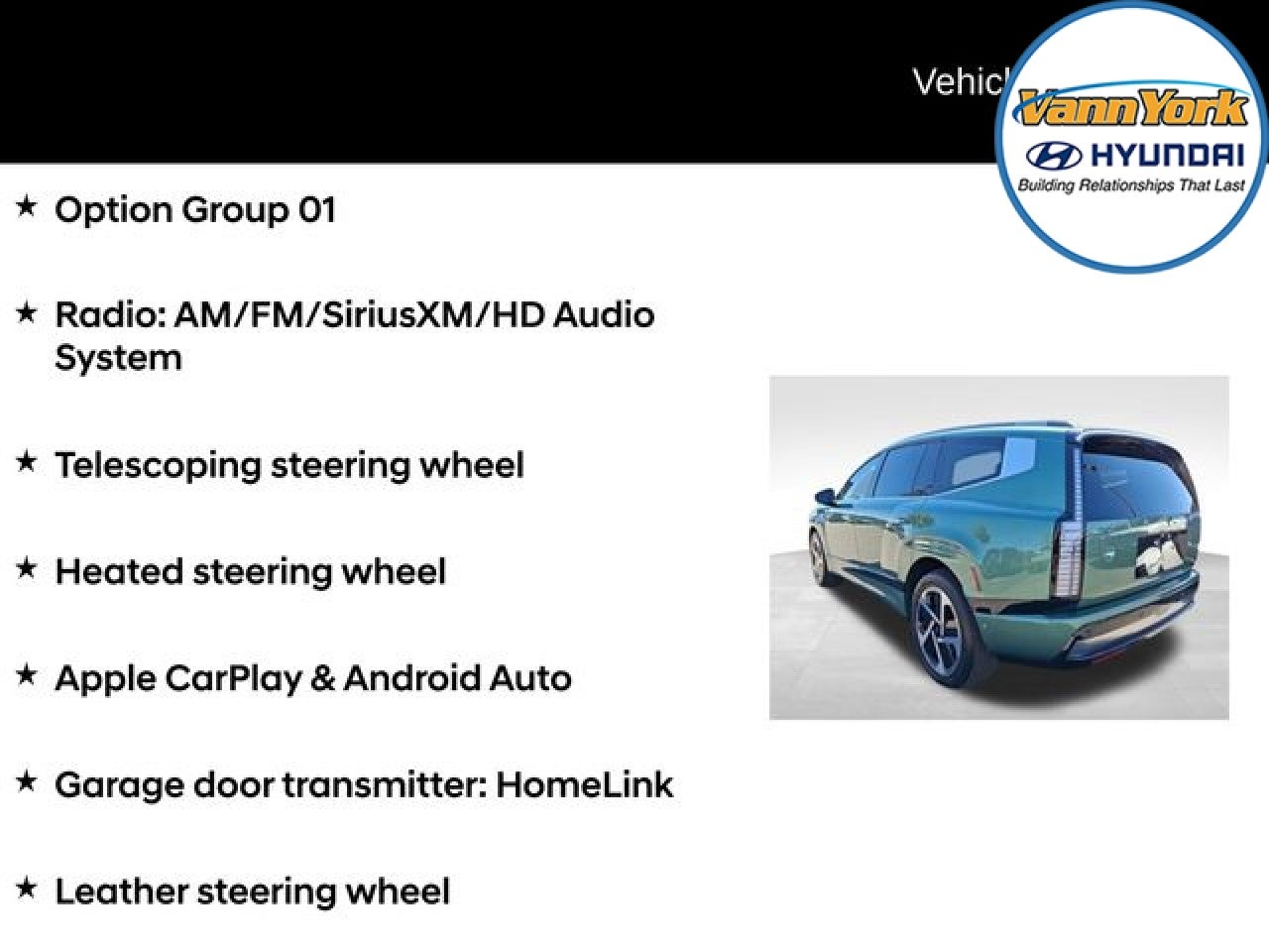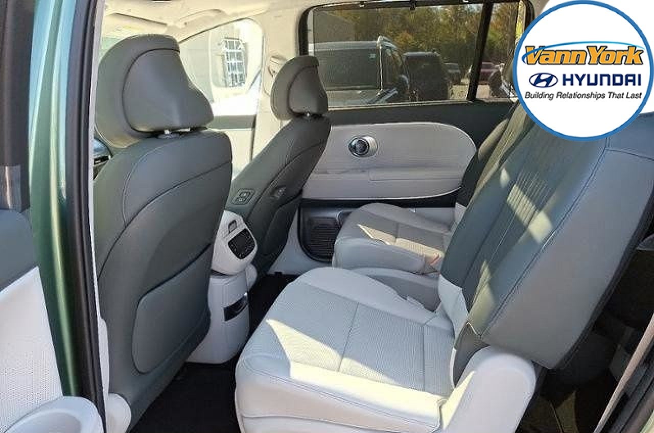 Here hd traffic real-time traffic display|wireless phone connectivity|window grid antenna|2 lcd monitors in the front|14 speakers|radio w/seek-scan, clock, speed compensated volume control, steering wheel controls and voice activation|radio: am/fm/siriusxm/hd audio system -inc: 12.3 navigation, bose premium audio w/14 speakers, wireless android auto and apple carplay, blue link connected car system, vehicle wi-fi hotspot, usb input, bluetooth multiple device connection, over-the-air (ota) controller ecu, map/multimedia software update capability, e-active sound design and active noise control|deep tinted glass|galvanized steel/aluminum panels|express open/close sliding and tilting glass panoramic 1st and 2nd row sunroof w/power sunshade|led brakelights|auto on/off projector beam led low/high beam daytime running auto high-beam headlamps w/delay-off|tailgate/rear door lock included w/power door locks|black grille|wheels: 21 x 9j 5-spoke alloy|power liftgate rear cargo access|body-colored door handles|body-colored front bumper w/metal-look rub strip/fascia accent and black bumper insert|fixed rear window w/wiper and defroster|laminated glass|black bodyside moldings and body-colored wheel well trim|body-colored rear bumper w/metal-look rub strip/fascia accent and body-colored bumper insert|perimeter/approach lights|headlights-automatic highbeams|tire mobility kit|metal-look side windows trim|body-colored power w/tilt down heated side mirrors w/power folding and turn signal indicator|lip spoiler|rain detecting variable intermittent wipers|tires: 285/45r21 as|front cupholder|air filtration|premium grade h-tex leatherette seating surfaces|instrument panel bin, driver / passenger and rear door bins|carpet floor trim|mobile hotspot internet access|memory settings -inc: driver seat, door mirrors and steering wheel|integrated navigation system w/voice activation|hvac -inc: underseat ducts and headliner/pillar ducts|cargo space lights|cargo features -inc: tire mobility kit|remote keyless entry w/integrated key transmitter, illuminated entry, illuminated ignition switch and panic button|head-up display|front and rear map lights|gauges -inc: speedometer, odometer, traction battery level, power/regen, trip odometer and trip computer|2 seatback storage pockets|homelink garage door transmitter|2 12v dc power outlets and 1 interior 120v ac power outlet|heated leather steering wheel|immobilizer|digital/analog appearance|driver information center|manual adjustable front head restraints and manual adjustable rear head restraints|illuminated glove box|trunk/hatch auto-latch|interior trim -inc: aluminum instrument panel insert, metal-look door panel insert, metal-look console insert and metal-look interior accents|fixed 50-50 bench 3rd row seat front, power recline, power fold into floor, 2 manual and adjustable head restraints|rear hvac w/separate controls|leatherette door trim insert|proximity key for doors and push button start and smart device proximity key|driver and passenger visor vanity mirrors w/driver and passenger illumination, driver and passenger auxiliary mirror|fob controls -inc: keyfob cargo access and keyfob window activation|outside temp gauge|delayed accessory power|full carpet floor covering|trip computer|sliding front center armrest and rear seat mounted armrest|bucket folding captain front facing heated power reclining fold forward seatback ventilated, rear seat w/power fore/aft, power cushion tilt, power folding activation and 2 foot/leg rests|smart device integration|power door locks w/autolock feature|power rear windows, fixed 3rd row windows and w/manual 2nd row sun blinds|day-night auto-dimming rearview mirror|perimeter alarm|heated & ventilated front bucket seats -inc: relaxation front seats, 8-way power ergo motion driver seat w/4-way power lumbar, 8-way power passenger seat w/2-way power lumbar, integrated memory system (ims) for driver and front seatback pockets|sliding floor console w/covered storage, mini overhead console, 2 12v dc power outlets and 1 interior 120v ac power outlet|cruise control w/steering wheel controls|remote releases -inc: proximity cargo access and keyfob charge port door|full simulated suede headliner|redundant digital speedometer|power 1st row windows w/front and rear 1-touch up/down|2-way power driver seat -inc: power seatback side bolster support|rear cupholder|driver foot rest|valet function|power tilt/telescoping steering column|voice activated dual zone front automatic air conditioning|metal-look gear shifter material|smart device remote engine start|2 12v dc power outlets|smart cruise control with stop & go (scc)|passenger seat|bluelink+ tracker system|cargo area concealed storage|fade-to-off interior lighting|permanent locking hubs|7319# gvwr|electric power-assist steering|multi-link rear suspension w/coil springs|lithium ion (li-ion) traction battery w/10.9 kw onboard charger, 9.6 hrs charge time