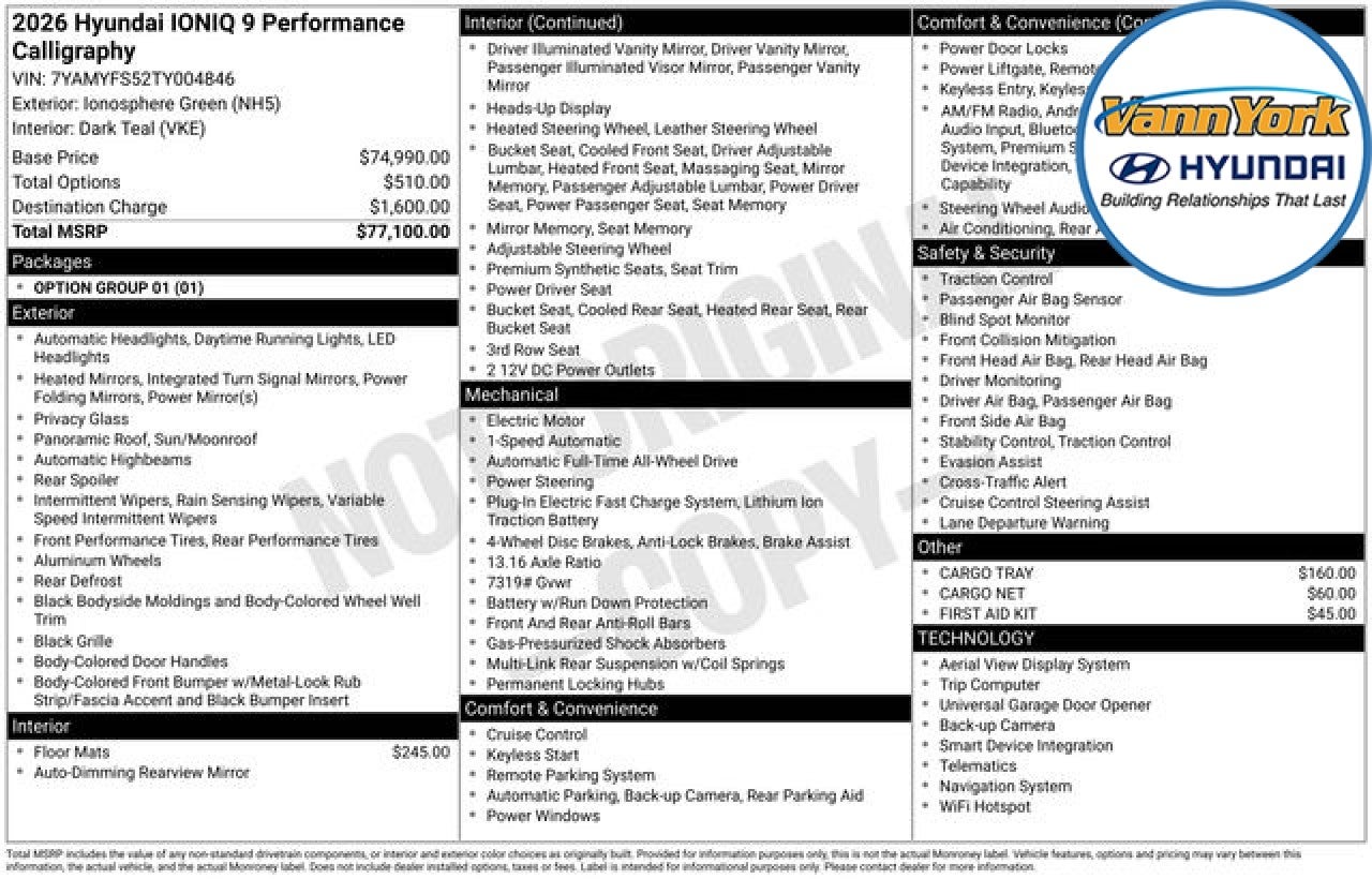 The 2026 Hyundai IONIQ 9 Performance Calligraphy is a remarkable electric vehicle that redefines the future of sustainable transportation. With its sleek and sophisticated design, cutting-edge technology, and impressive performance, this SUV is the perfect choice for the discerning driver who demands both style and substance. Boasting a suite of premium features, the IONIQ 9 is tailored to exceed your expectations. Key highlights include: - Panoramic power moonroof - Power liftgate - Heads-up display - Heated and ventilated front and rear seats - Leather-wrapped steering wheel - Garage door transmitter - 14-speaker premium audio system Beyond these standout amenities, the IONIQ 9 also offers the convenience of Apple CarPlay and Android Auto, as well as a comprehensive suite of advanced safety technologies to keep you and your passengers secure on the road. Powered by an electric motor and all-wheel drive, this SUV delivers exceptional performance and efficiency, with an estimated MPGe rating that will impress even the most eco-conscious driver. The IONIQ 9's responsive handling and smooth acceleration provide a truly engaging driving experience, while its long-range battery ensures you can confidently tackle your daily commute and beyond without range anxiety. Crafted with meticulous attention to detail, the IONIQ 9's interior is a masterclass in luxury and sophistication. The premium Leatherette seating surfaces, coupled with the reclining third-row seats, offer unparalleled comfort and versatility. The intuitive infotainment system and the heads-up display seamlessly integrate technology into the driving experience, keeping you connected and informed at all times. Safety is of the utmost importance, and the IONIQ 9 delivers with a comprehensive suite of advanced driver assistance features. From the automatic emergency braking and lane-keeping assist to the blind-spot monitoring and rear cross-traffic alert, this SUV is designed to help you navigate the roads with confidence and peace of mind. As you consider your next vehicle, the 2026 Hyundai IONIQ 9 Performance Calligraphy should be at the top of your list. With its exceptional performance, uncompromising luxury, and cutting-edge technology, this SUV is poised to redefine the way you experience the open road. We invite you to visit our showroom and explore this remarkable vehicle for yourself. Let us demonstrate how the IONIQ 9 can elevate your driving experience and become the perfect companion for your adventures. Price includes: $10000 - Retail Bonus Cash. Exp. 03/31/2026