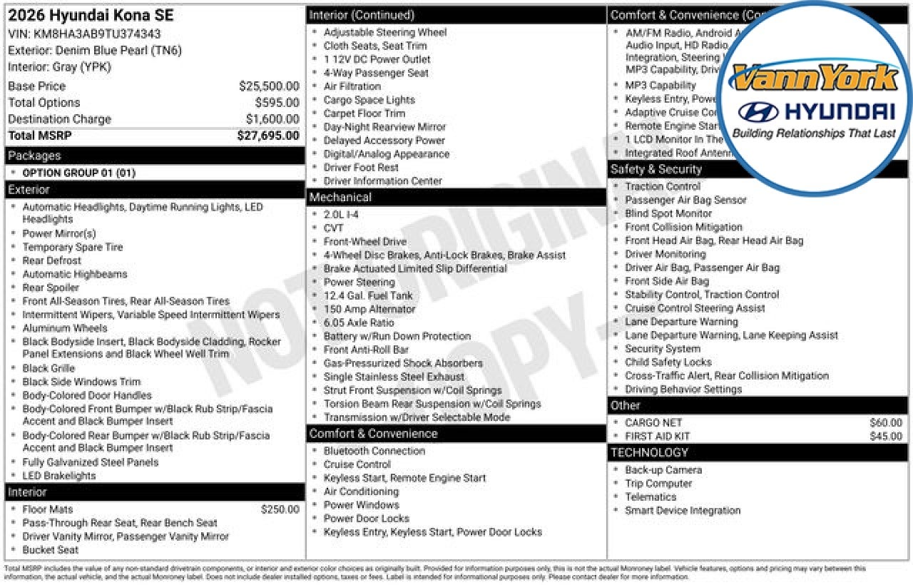 Discover the perfect blend of style, technology, and performance in the 2026 Hyundai Kona SE. This compact crossover SUV is designed to elevate your driving experience, offering a dynamic and efficient ride that will captivate your senses. - All-Weather Fitted Liners - Carpeted Floor Mats - Cargo Net - First Aid Kit - Option Group 01 - Radio: AM/FM/SiriusXM/HD Audio System - Remote Keyless Entry - Speed-Sensing Steering - Dual Front Impact Airbags - Exterior Parking Camera Rear - Auto High-beam Headlights - Security System - Speed Control - Power Door Mirrors - Apple CarPlay & Android Auto Powered by a 2.0L I4 DOHC 16V engine paired with a smooth-shifting CVT transmission, the Kona SE delivers an impressive balance of power and efficiency, with an EPA-estimated 29 mpg in the city and 34 mpg on the highway. Its sleek and modern exterior design, complemented by the stunning Blue paint, is sure to turn heads wherever you go. Inside, the Kona SE offers a spacious and well-appointed cabin, with a host of advanced features to keep you connected and entertained. The AM/FM/SiriusXM/HD Audio System provides a premium listening experience, while the Apple CarPlay and Android Auto integration seamlessly integrate your smartphone with the vehicle's infotainment system. Safety is also a top priority in the Kona SE, with a suite of advanced driver assistance technologies, including Dual Front Impact Airbags, Exterior Parking Camera Rear, and Auto High-beam Headlights, ensuring your peace of mind on the road. Whether you're navigating the city streets or exploring the open roads, the 2026 Hyundai Kona SE is the perfect companion to elevate your driving experience. Visit our showroom today to take this exceptional crossover for a test drive and discover how it can enhance your daily commute and weekend adventures. Price includes: $1000 - Hyundai HMF Dealer Choice : $1000 discount and 5.39% APR for 24 months. $44.05 per $1000 financed. Available to well qualified buyers who finance through Hyundai Motor Finance. H704. Exp. 03/31/2026
