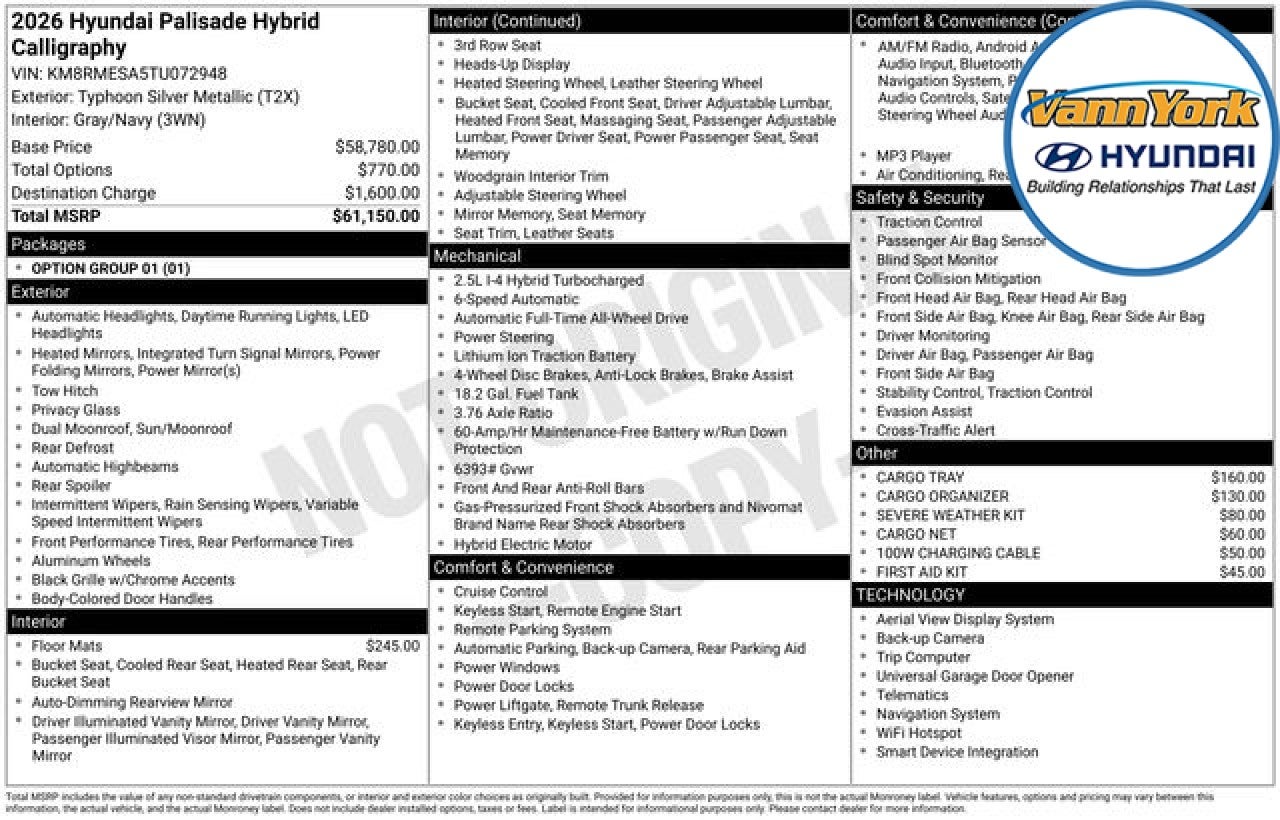 Elevate your driving experience with the exceptional 2026 Hyundai Palisade Hybrid Calligraphy. This stunning SUV combines unparalleled luxury, cutting-edge technology, and exceptional efficiency, making it the perfect choice for the discerning driver. Boasting a robust 2.5L Turbocharged GDI 4-Cylinder Hybrid engine paired with a 6-Speed Automatic transmission and All-Wheel Drive, the Palisade Hybrid delivers an impressive balance of power and fuel economy, with an EPA-estimated 29 MPG in the city and 30 MPG on the highway. Tailored to your needs, this Palisade Hybrid Calligraphy offers a meticulously curated selection of premium features, including: - Cargo Tray - Cargo Organizer - Severe Weather Kit - 100W Charging Cable - First Aid Kit Elevate your driving experience with the Palisade Hybrid Calligraphy's advanced technologies, such as the Navigation System, Heads-Up Display, and Apple CarPlay & Android Auto integration. Indulge in the comfort of Nappa Leather seating, a Heated Steering Wheel, and Heated and Ventilated Front Seats. Safety is paramount in the Palisade Hybrid Calligraphy, with features like Electronic Stability Control, Auto High-beam Headlights, and a comprehensive suite of airbags providing you and your loved ones with the utmost protection. Exuding elegance and sophistication, the Palisade Hybrid Calligraphy's stunning Silver exterior and 21-inch Alloy Wheels make a bold statement wherever you go. The Power Liftgate and Cargo Net ensure effortless loading and unloading, while the Carpeted Floor Mats and Cargo Tray keep your vehicle pristine. Experience the pinnacle of Hyundai's engineering and design in the 2026 Palisade Hybrid Calligraphy. Visit our showroom today and let us demonstrate how this exceptional SUV can elevate your driving experience. We're confident you'll be captivated by its unrivaled blend of luxury, technology, and performance. Price includes: $500 - Hyundai HMF Dealer Choice : $500 discount and 5.39% APR for 24 months. $44.05 per $1000 financed. Available to well qualified buyers who finance through Hyundai Motor Finance. H704. Exp. 03/31/2026