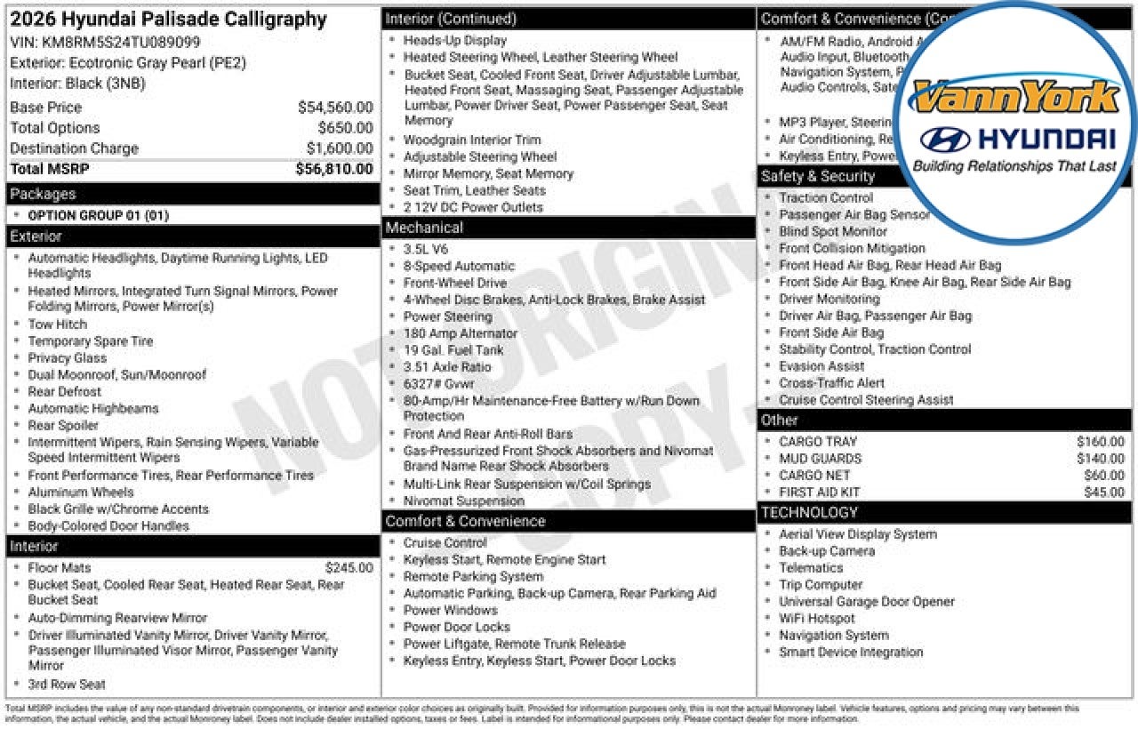 The 2026 Hyundai Palisade Calligraphy is a stunning SUV that offers unparalleled luxury, technology, and performance. With its sleek exterior design, spacious and well-appointed interior, and advanced features, this vehicle is the perfect choice for the discerning driver who demands the best. This Palisade Calligraphy comes equipped with an impressive array of premium features, including: - Navigation System - AM/FM radio: SiriusXM - Infotainment Navigation System - Automatic temperature control - Heads-Up Display - Memory seat - Power driver seat - Remote keyless entry - Four wheel independent suspension - Dual front impact airbags - Power Liftgate - Electronic Stability Control - Exterior Parking Camera Rear - Auto High-beam Headlights - Security system - Heated door mirrors - Apple CarPlay & Android Auto - Garage door transmitter: HomeLink - Genuine wood console insert - Genuine wood dashboard insert - Heated steering wheel - Leather steering wheel - Telescoping steering wheel - Heated front seats - Heated rear seats - Premium Nappa Leather Seat Trim - Split folding rear seat - Wheels: 21 x 8.5J Alloy - Rain sensing wipers Under the hood, this Palisade Calligraphy is powered by a robust V6 engine mated to an 8-speed automatic transmission, delivering a smooth and responsive driving experience. With an impressive fuel efficiency of 19 MPG in the city and 25 MPG on the highway, this SUV offers the perfect balance of power and efficiency. The spacious and well-appointed interior of the Palisade Calligraphy is designed to provide the ultimate in comfort and convenience. From the premium Nappa leather seating to the advanced infotainment system, every detail has been carefully crafted to enhance the driving experience. The Heads-Up Display and Memory Seat features add an extra layer of convenience, while the Garage Door Transmitter and Heated Steering Wheel ensure that you'll enjoy every journey. Safety is also a top priority in the Palisade Calligraphy, with a host of advanced driver assistance features, including Electronic Stability Control, Exterior Parking Camera Rear, and Auto High-beam Headlights. These technologies work together to provide you with the confidence and peace of mind you need on the road. Whether you're transporting your family, embarking on a road trip, or simply enjoying the daily commute, the 2026 Hyundai Palisade Calligraphy is the perfect vehicle to elevate your driving experience. With its exceptional blend of luxury, technology, and performance, this SUV is sure to exceed your expectations. We invite you to visit our showroom and experience the Palisade Calligraphy for yourself. Price includes: $1000 - Hyundai HMF Dealer Choice : $1000 discount and 5.39% APR for 24 months. $44.05 per $1000 financed. Available to well qualified buyers who finance through Hyundai Motor Finance. H704. Exp. 03/31/2026 $2000 - Sales Event Cash. Exp. 03/31/2026