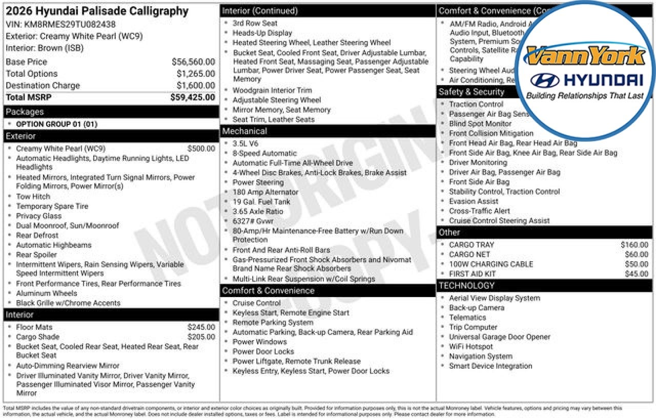 The 2026 Hyundai Palisade Calligraphy is a true standout in the SUV segment, offering a remarkable blend of style, capability, and cutting-edge technology. With its striking Creamy White Pearl exterior and premium Nappa leather interior, this Palisade is a testament to Hyundai's commitment to delivering exceptional quality and refinement. - Navigation System - AM/FM radio: SiriusXM - Radio: Infotainment Navigation System - Automatic temperature control - Heads-Up Display - Memory seat - Power driver seat - Remote keyless entry - Four wheel independent suspension - Dual front impact airbags Beneath the sculpted hood, the Palisade Calligraphy boasts a powerful V6 engine paired with an 8-speed automatic transmission and all-wheel drive, ensuring a confident and responsive driving experience in any conditions. With an impressive 18 city/24 highway MPG, this SUV strikes the perfect balance between performance and efficiency. The Palisade Calligraphy's interior is a true sanctuary, with premium features that elevate the driving experience. Sink into the heated and ventilated front seats, enjoy the warmth of the heated steering wheel, and marvel at the seamless integration of the Infotainment Navigation System. The Heads-Up Display, Apple CarPlay, and Android Auto connectivity keep you informed and connected, while the panoramic sunroof and premium audio system create an immersive atmosphere. Safety is a top priority in the Palisade Calligraphy, with a suite of advanced driver-assistance technologies, including Electronic Stability Control, Exterior Parking Camera Rear, and Auto High-beam Headlights. The Palisade's robust construction and comprehensive airbag system provide unparalleled protection for you and your loved ones. Versatility is at the heart of the Palisade Calligraphy, with a spacious and flexible interior that can accommodate up to eight passengers or ample cargo. The power liftgate and reclining third-row seats make loading and unloading a breeze, while the Cargo Cover, Cargo Net, and Cargo Tray keep your belongings secure and organized. Experience the exceptional craftsmanship, advanced technology, and uncompromising capability of the 2026 Hyundai Palisade Calligraphy. Visit our showroom today and let us demonstrate how this remarkable SUV can elevate your driving experience. Price includes: $1000 - Hyundai HMF Dealer Choice : $1000 discount and 5.39% APR for 24 months. $44.05 per $1000 financed. Available to well qualified buyers who finance through Hyundai Motor Finance. H704. Exp. 03/31/2026 $2000 - Sales Event Cash. Exp. 03/31/2026