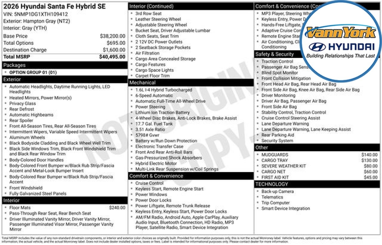 The 2026 Hyundai Santa Fe Hybrid SE is a remarkable SUV that combines style, performance, and advanced technology to elevate your driving experience. With its sleek exterior, spacious interior, and impressive fuel efficiency, this vehicle is the perfect blend of form and function. - Carpeted Floor Mats - Mudguards - Cargo Tray - Severe Weather Kit - Cargo Net - First Aid Kit - Radio: AM/FM/HD Display Audio - Automatic temperature control - Remote keyless entry - Four wheel independent suspension - Dual front impact airbags - Emergency communication system - Occupant sensing airbag - Power Liftgate Under the hood, the Santa Fe Hybrid SE boasts a powerful I4 engine mated to a 6-Speed Automatic with Shiftronic transmission, delivering a seamless and responsive driving experience. With its advanced all-wheel-drive system, you'll enjoy confident handling in all weather conditions, while the impressive fuel economy of 35 city/34 highway MPG* ensures you can go further on every tank. The interior of the Santa Fe Hybrid SE is a haven of comfort and convenience. The YES Essentials Stain-Resistant Cloth Seat Trim provides a premium feel, while the leather-wrapped steering wheel and telescoping feature offer a personalized driving position. Stay connected with the intuitive Apple CarPlay and Android Auto integration, and keep your vehicle secure with the standard security system. Safety is a top priority, and the Santa Fe Hybrid SE delivers with a suite of advanced driver-assistance technologies. Enjoy the peace of mind of features like the Exterior Parking Camera Rear, Auto High-beam Headlights, and Electronic Stability Control, all working together to help you navigate the road with confidence. Whether you're embarking on a family adventure or commuting in style, the 2026 Hyundai Santa Fe Hybrid SE is the perfect companion. Experience the perfect balance of performance, efficiency, and cutting-edge technology by visiting our showroom today. We're confident you'll be impressed by this exceptional SUV. *EPA estimates. Actual mileage may vary. Price includes: $4000 - Hyundai HMF Dealer Choice : $4000 discount and 5.39% APR for 24 months. $44.05 per $1000 financed. Available to well qualified buyers who finance through Hyundai Motor Finance. H704. Exp. 03/31/2026