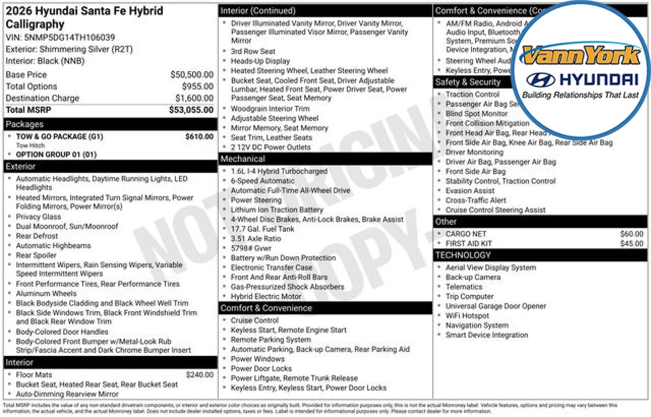 Discover the exceptional 2026 Hyundai Santa Fe Hybrid Calligraphy, a true masterpiece of engineering and design. This captivating SUV is poised to redefine your driving experience, blending sophisticated style, advanced technology, and uncompromising performance. Elevate your commute with an impressive array of premium features, including: - Tow & Go Package - Carpeted Floor Mats - Navigation System - AM/FM radio: SiriusXM - Radio: AM/FM/HD Bose Premium Audio System - Automatic temperature control - Heads-Up Display - Memory seat - Power driver seat - Remote keyless entry - Four wheel independent suspension - Dual front impact airbags - Emergency communication system - Occupant sensing airbag - Overhead airbag - Power moonroof - Power Liftgate - Electronic Stability Control - Exterior Parking Camera Rear - Fully automatic headlights - Security system - Speed control - Heated door mirrors - Power door mirrors - Apple CarPlay & Android Auto - Garage door transmitter: HomeLink - Heated steering wheel - Leather steering wheel - Telescoping steering wheel - Heated front seats - Heated rear seats - Quilted Premium Nappa Leather Seat Trim - Split folding rear seat - Cargo Net - Tow Hitch - Tow Hitch Ball Mount Kit - Rain sensing wipers - Variably intermittent wipers. Slip behind the wheel and experience the power of the Hyundai Santa Fe Hybrid's i4 engine, paired with a 6-Speed Automatic with Shiftronic and all-wheel drive. This exceptional SUV delivers an impressive 35 MPG in the city and 34 MPG on the highway, ensuring exceptional efficiency without sacrificing performance. Designed with your comfort and convenience in mind, the Santa Fe Hybrid Calligraphy boasts a spacious and well-appointed interior, with ample room for passengers and cargo alike. The premium Nappa leather seating, coupled with advanced climate control and a panoramic moonroof, create a sanctuary of luxury and refinement. Safety is paramount, and the Santa Fe Hybrid Calligraphy delivers with a suite of advanced driver-assistance technologies, including Blind Spot Monitoring, Rear Cross-Traffic Alert, and Forward Collision-Avoidance Assist. You can drive with confidence, knowing that you and your loved ones are well-protected. Experience the pinnacle of hybrid SUV design and engineering with the 2026 Hyundai Santa Fe Hybrid Calligraphy. Schedule a test drive today and discover the perfect balance of power, efficiency, and sophistication that will elevate your driving experience to new heights. Price includes: $4000 - Hyundai HMF Dealer Choice : $4000 discount and 5.39% APR for 24 months. $44.05 per $1000 financed. Available to well qualified buyers who finance through Hyundai Motor Finance. H704. Exp. 03/31/2026
