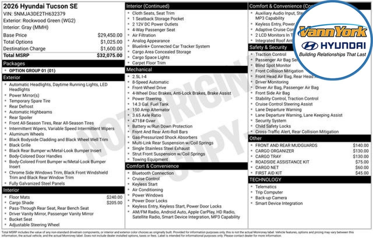 Discover the exceptional 2026 Hyundai Tucson SE, a versatile and refined SUV that seamlessly blends style, performance, and advanced technology. This meticulously crafted vehicle is poised to elevate your driving experience and exceed your expectations. Equipped with a robust 2.5L I4 DGI DOHC 16V engine, the Tucson SE delivers a thrilling 187 horsepower, coupled with an 8-Speed Automatic transmission with SHIFTRONIC for a smooth and responsive ride. Boasting an impressive fuel efficiency of 25 MPG in the city and 33 MPG on the highway, this SUV strikes the perfect balance between power and efficiency. - Cargo Cover - Cargo Organizer - Cargo Tray - AM/FM radio: SiriusXM - Radio: AM/FM/HD Audio System - Remote keyless entry - Four wheel independent suspension - Dual front impact airbags - Dual front side impact airbags - Electronic Stability Control - Auto High-beam Headlights - Fully automatic headlights - Security system - Speed control The exquisite exterior of the 2026 Tucson SE features a stunning Green hue, complemented by 17 Alloy Wheels and a sleek, aerodynamic design that turns heads wherever you go. Step inside the cabin and you'll be greeted by a spacious and well-appointed interior, with Cloth Seat Trim and a host of convenience features, including Steering Wheel Mounted Audio Controls, Power Windows, and a Rear Window Wiper. Safety is of the utmost importance, and the Tucson SE delivers with a comprehensive suite of advanced safety technologies. From Dual Front Impact Airbags and Dual Front Side Impact Airbags to Electronic Stability Control and a Rear Anti-Roll Bar, you can rest assured that you and your loved ones will be well-protected on the road. Experience the exceptional craftsmanship and cutting-edge features of the 2026 Hyundai Tucson SE. This SUV is the perfect blend of style, performance, and safety, making it the ideal choice for discerning drivers who demand the best. Visit our showroom today and let us demonstrate why the Tucson SE should be your next vehicle. Price includes: $3000 - Hyundai HMF Dealer Choice : $3000 discount and 5.39% APR for 24 months. $44.05 per $1000 financed. Available to well qualified buyers who finance through Hyundai Motor Finance. H704. Exp. 03/31/2026