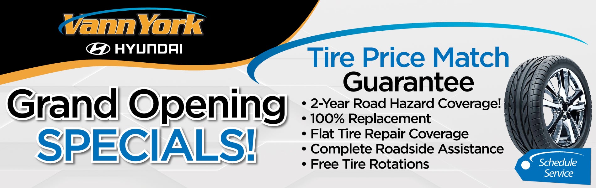 Disclosures: Please present coupon during write-up. No cash value. Some restrictions may apply. Not to be combined with any other discounts. Matching tire quote must include mount, balance, taxes and disposal fee. All Vann York Auto Group locations offer complimentary tire rotations for the life of the tires PLUS road hazard coverage, roadside assistance and tire warranty. Coverages and tire warranty vary by brand. See your service advisor for details.