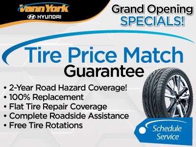Disclosures: Please present coupon during write-up. No cash value. Some restrictions may apply. Not to be combined with any other discounts. Matching tire quote must include mount, balance, taxes and disposal fee. All Vann York Auto Group locations offer complimentary tire rotations for the life of the tires PLUS road hazard coverage, roadside assistance and tire warranty. Coverages and tire warranty vary by brand. See your service advisor for details.